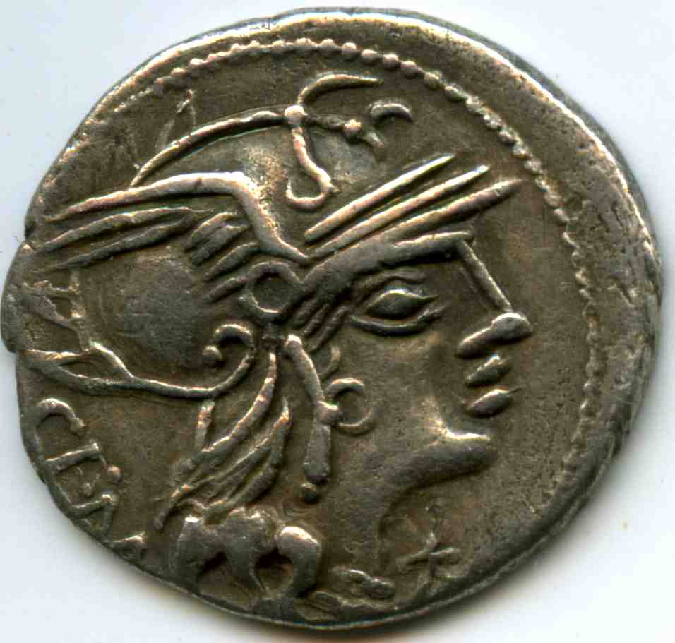 C38. Types of M. Atilius Saranus, after 148 BC; cf. Cr-214/1b, 3.98g. Both sides slightly stylized, with mostly accurate legends; note especially the curved lance and odd depression around reverse legend.