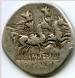 C39. Types of L. Trebanius, after 135 BC; cf. Cr-241/1, 4.63g. Both sides somewhat stylized; traces of blundered legend below horses, blundered, retrograde ROMA in exergue.