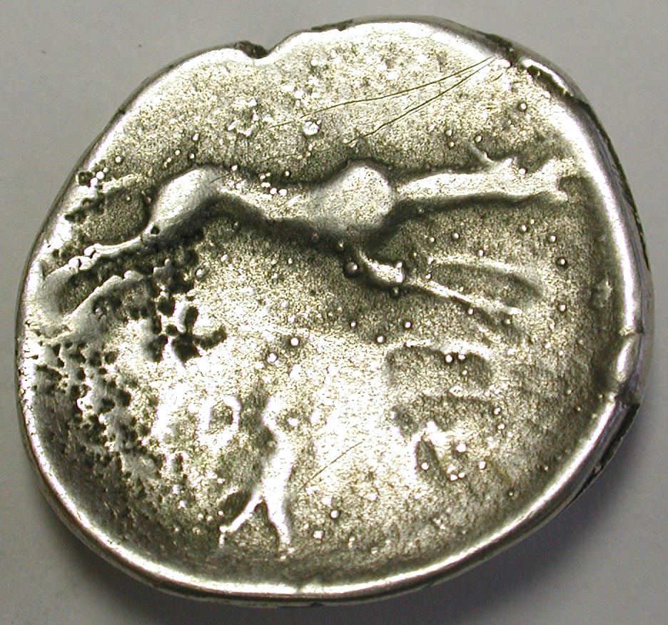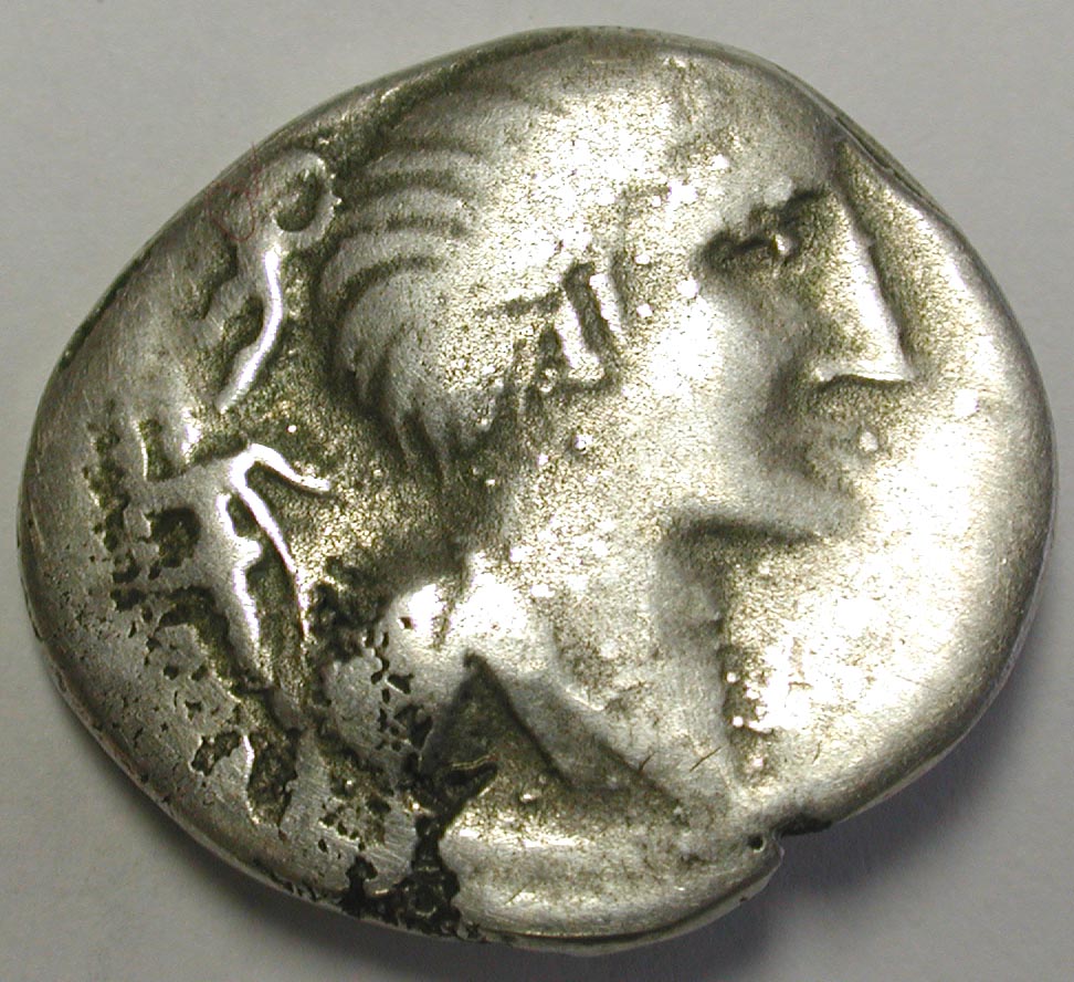 E15. Types of C. Postumius, after 74 BC; Freeman 24 (17/P), Chitescu 173, cf. Cr-394/1; 2.87g. Both sides somewhat stylized, remnants of correct legend on reverse. Unusual surface with droplets and depressions implying casting, but a "wrapped" edge seam more consistent with a plated piece. The dies are unquestionably Eraviscan, and specimens exist with "normal" fabric. Might this be an ancient forgery, derived from an imitation?